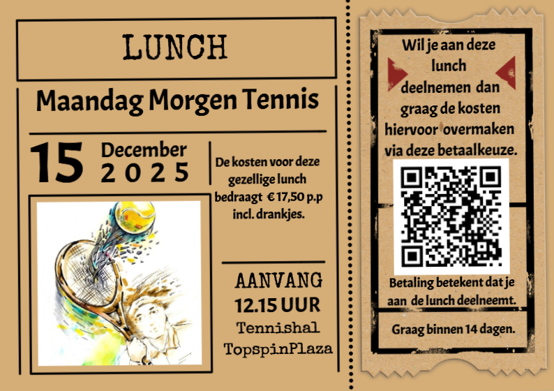 In navolging op onze lunches zoals voorgaande jaren is na afloop van onze tennismorgen op de 19e december om 12.15 uur wederom een lunch.