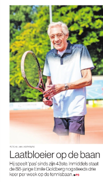 Je moet gewoon slaan waar je tegenstanders niet staan'Emile (88) staat nog drie keer per week op de tennisbaanDe 88-jarige Emile Goldberg is de definitie van een sportfanaat. Schaatsen, volleyballen, tafeltennissen, voetballen, niets is hem te gek. Vanaf zijn 43ste speelt één sport de hoofdrol en dat is tennissen.ANNE VAN BIJNEN